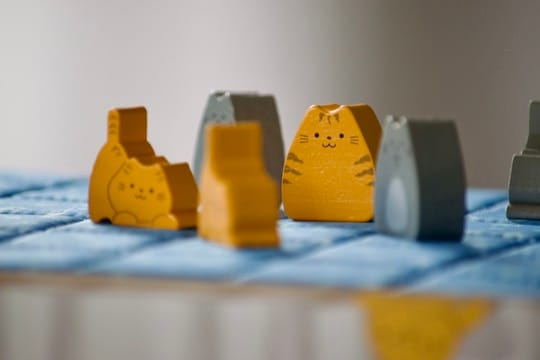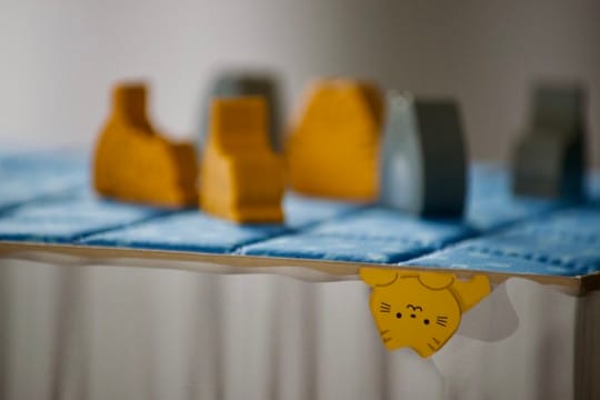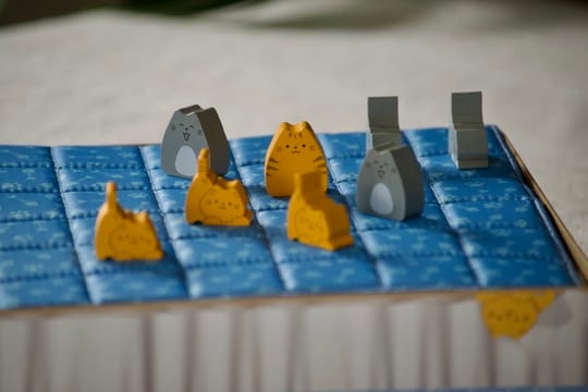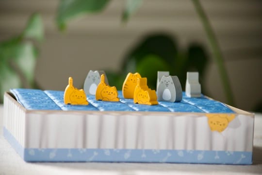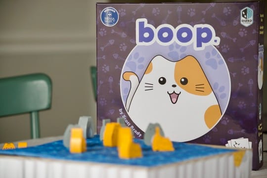 boop. is a cute little strategy feel like a step up from checkers. Each turn all you do is plop a kitten or cat onto the board and try to ge 3 in a row. The hook is that when you place a kitten or cat they “boop” any adjacent pieces away.
