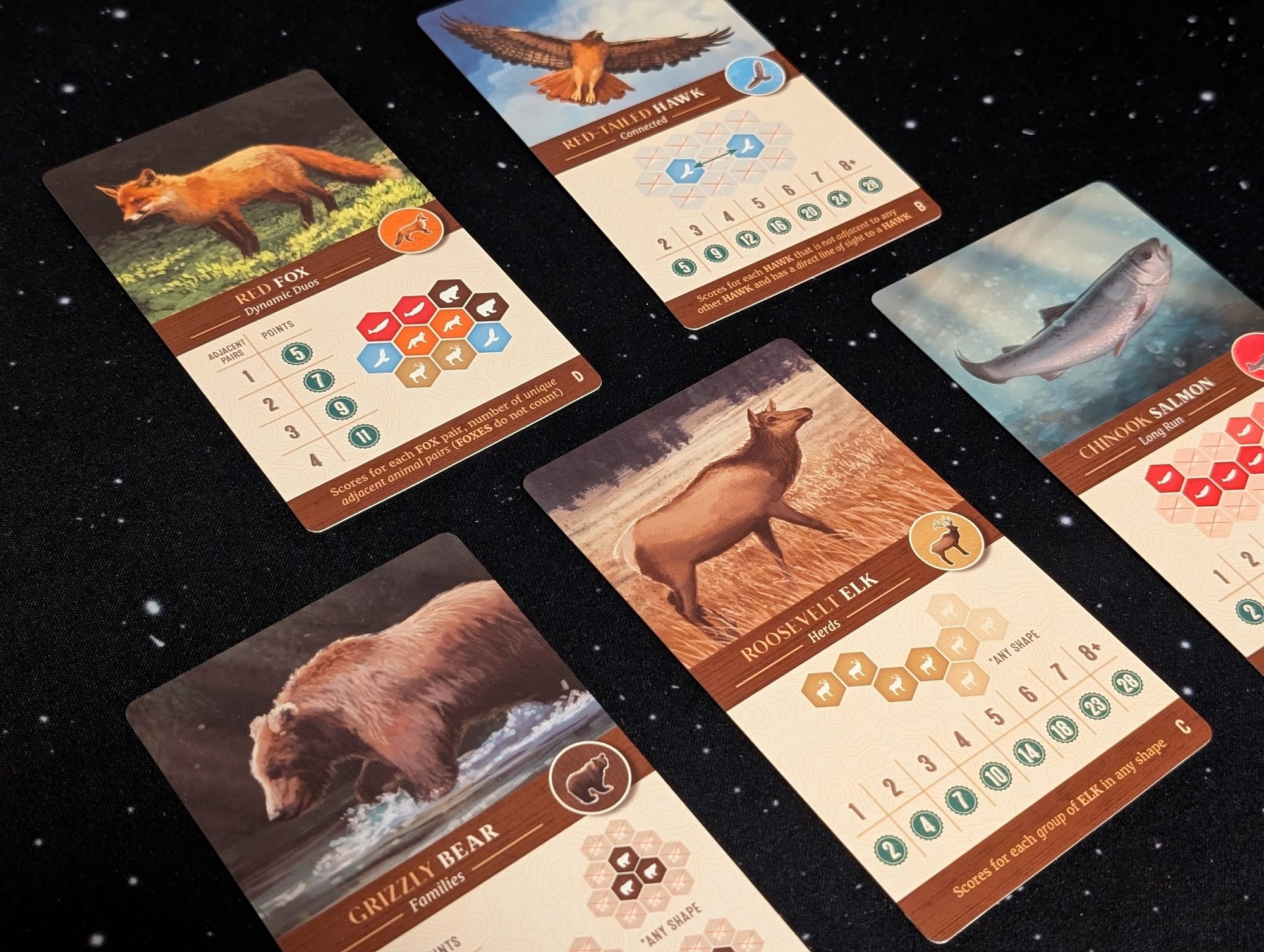 Bears are separated by a heard of elk. Scoring is a bit lengthy, with five animals and five terrain types to count, but it creates a fun tension—someone might dominate bear scoring while another cleans up on hawks. There’s also a “family variant” scoring card, which simplifies scoring by only rewarding groups of animals instead of complex patterns—perfect for younger players or those looking for a lighter experience.